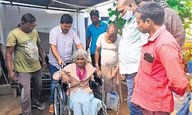 IAS officer Parikipandla Narahari (2nd from left) and Alaya Foundation volunteers handover a wheelchair to a differently-abled elderly person | Express