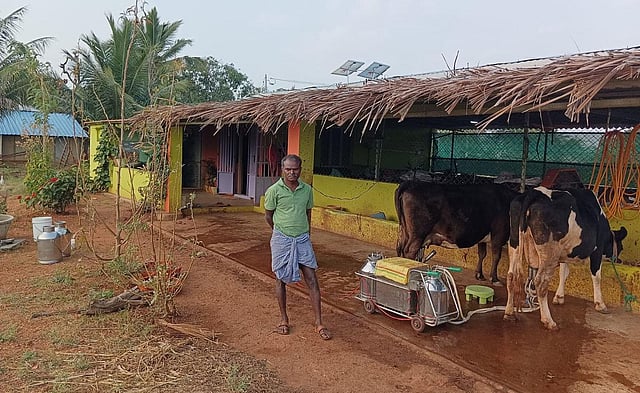 To make milking of cows and buffaloes a quicker, hassle-free, and cost-effective process, several farmers in Chitradurga district have adopted solar-powered milking machines. Thanks to abundant sunlight in these parts, these sustainable technological wonders have not only eased the milking process, but also reduced the time to milk each animal. Unlike 30 minutes usually needed to milk one cow, apart from the excess labour required, a machine like this with its two milk-drawing points draws milk in 8-12 minutes, and can be operated by a single person. With this machine, milk can be drawn from as many as 20-30 cows within an hour.