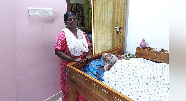 After love marriage, Saly shifted to Mookkannoor when she was 18. Her husband Sasi PV was paralysed 12 years later and has been paralysed for 27 years now. Saly, apart from all the work she does outside the household, cleans and feeds him. Gradually, neighbours who saw how well she cared for her husband asked for her help to care for other paralysed patients.