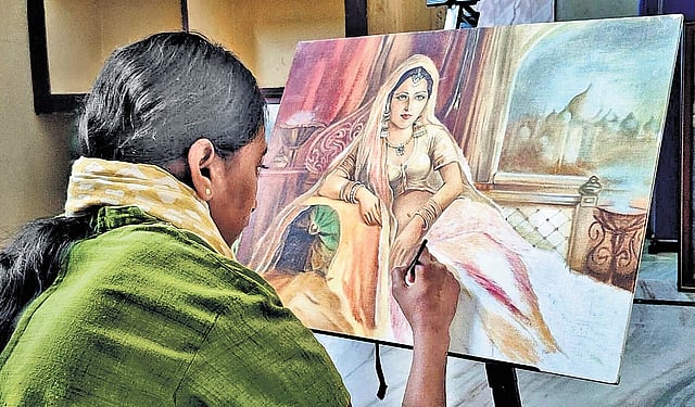 VILLUPURAM: She is hearing - and - speech-impaired and lives with a curved spine. Yet, when she sits before a canvas, these realities fade away, and a striking sense of grace and sensibility — which in her own words are inspired by the traditional style of Raja Ravi Varma – emerges in her strokes. Visitors who see her paintings displayed in her house at Parthasarathy Nagar, or hear about it in the neighbourhood, often bring photographs and place requests for custom-made portraits. That is how 43-year-old N Dhanalaksmi’s life in the quiet neighbourhood of Vazhudhareddy in Villupuram is subtly challenging the society’s idea of limitation.