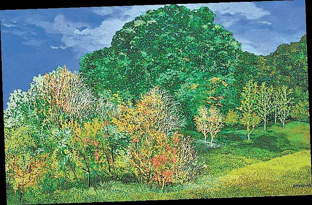These leaves hang in the air balancing their presence above the ground reminiscent of the British Romantic bard PB Shelley’s work ‘The Cloud’ which focusses on metamorphosis and its stages. It’s not surprising to see the influence of late master-artist Ram Kumar in his technique. “I met Ram in 1965 and studied under him for six months in Delhi,” he says adding that the roots of his works lie in the French Impressionism. No wonder then that his lotus pond series the ‘Pool of Life’ and ‘Dream of Nature’, are quite reminiscent of Monet. The artist, over a period of several engaging decades, has carved his own quintessential style. His artworks of the past 58 years bring forth the grammar of complexity in a subtler manner.