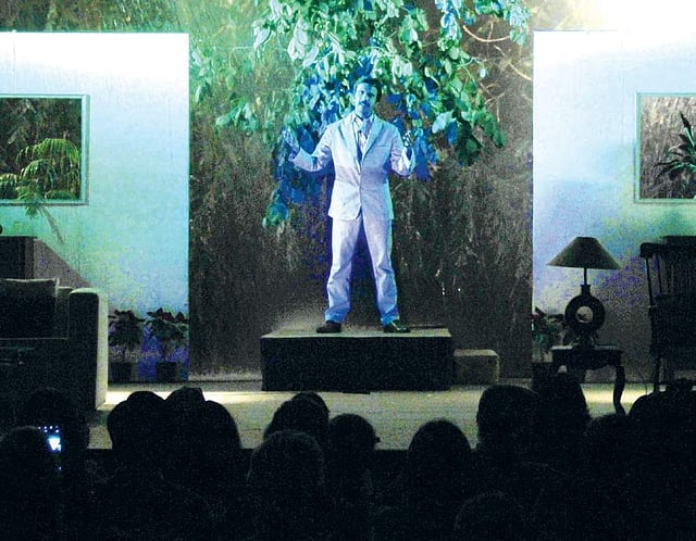 The period stage consisted of a makeshift oak tree in the background, antiquities, sepia tones and Persian rugs with lighting that spoke about the moods and emotions the young boy rendered. The scene in which the father dies is the most dramatic scene using a Monsoon backdrop along with rain falling over the protagonist under the oak tree.