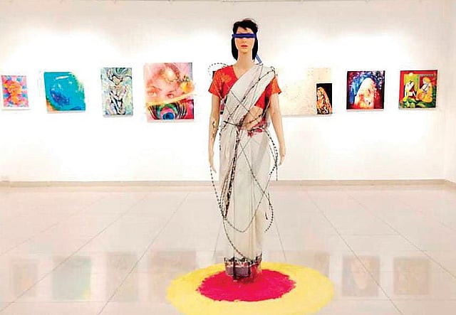 The show is for organised to raise funds for those affected by Covid-19. Among numerous artworks, the sculpture titled ‘My Boundary’. The installation by artist Ramu Maredu is of a woman in a sari with her body wrapped in a barbed wire. Her eyes are covered with a band of blue cloth.