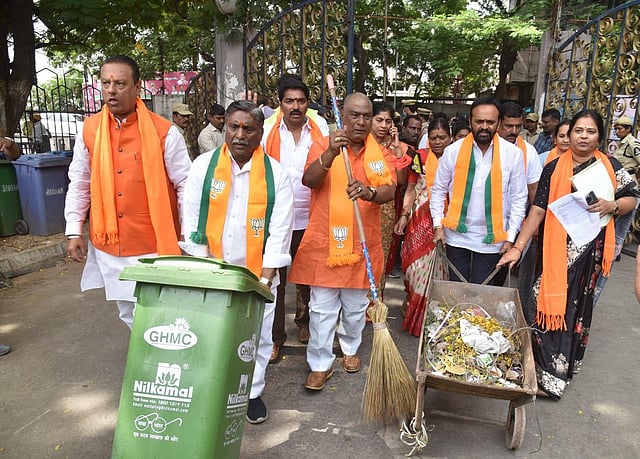 HYDERABAD: Tensions flared at the Greater Hyderabad Municipal Corporation (GHMC) head office on Wednesday with BJP and Congress corporators staging a protest in response to the abruptly short GHMC council meeting. The meeting, chaired by Mayor Gadwal Vijayalaxmi, was adjourned prematurely, sparking protests from the opposition corporators.