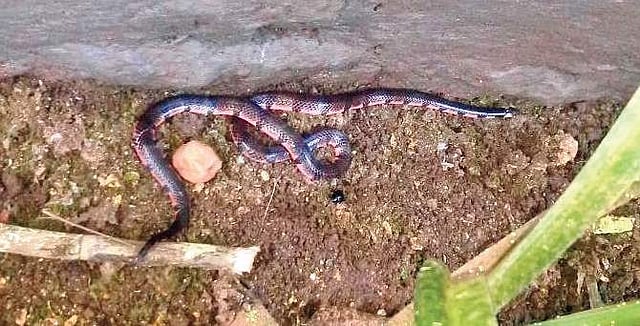 Bibron’s Coral snake is a venomous snake and its habitat includes hills and plains of moist, wet and evergreen forests of Western ghats. It spend most of its life as a borrower and comes occassionally on ground for foraging and mating, said Manjunath Nayak.