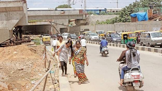 Drivers of BMTC buses curse pedestrians as they have to apply brakes to avoid hitting people. Just after RRR Kalyan Mantap, there is a railway bridge with no space for pedestrians to walk through. On either side, a narrow sloping structure is used as a footpath. What makes it more risky is the fact that it is dark inside. “Walking on the slope is better than walking on road,’’ feels Diwakar, a resident of Srirampura.