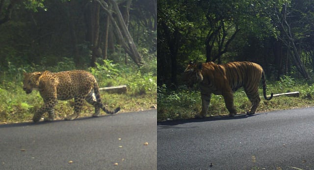 BENGALURU: Visitors to Bannerghatta Biological Park (BBP) would occasionally capture a wild tiger seated on the other side of the park enclosure, calling out to tigresses. However, at 1:57 PM on Tuesday, one of the striped cats was captured on camera traps taking a walk on the safari road. And it wasn’t the only one around. At 4 PM that day, a wild leopard took a stroll at the same location and was also captured by the camera.