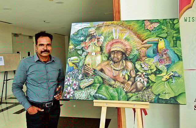 “Most of my paintings are visualisations of real-life incidents, with my police colleagues often serving as models. Occasionally, I add colourful backgrounds to enhance the composition. But at the core, I am a policeman, and that identity reflects in every work I create,” says Ananthalal.