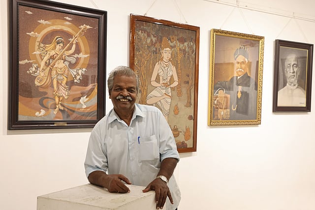 Artist Nemom Krishnan Nair has been turning grains of sand from around the world into artworks for decades. His recent exhibition held at Vyloppilly Samskrithi Bhavan Art Gallery marked his return after a gap of eight years
