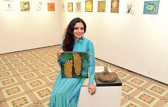 “Most of them are either state or national award winners,” says curator Bindhi. Regarding the theme of ‘Oradimannu’ (One Foot), Bindhi says, “The sun has a path, and so does the moon. Like all living beings, we human beings also have a path. When we stand at one place, the place belongs to you. But the moment you move, that space is no longer yours.”To illustrate the concept, Bindhi has done a drawing on a brass sheet showing the soles of two feet. It belongs to a student of Bindhi’s, who is a teacher in an architecture school. “He is a cancer survivor,” says Bindhi. “So he is a hero in my eyes.”