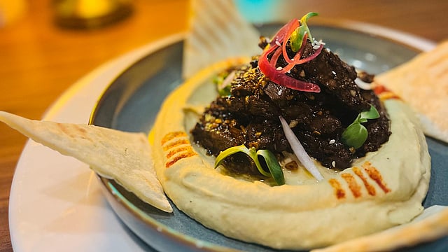 Earth & Flame sounds like the name of a song or a book, not a dish. Here, braised beef slices, marinated with salt, pepper, soya sauce, and other spices, are served with creamy hummus. There are a few pita slices also on the side. The interesting combination allowed the taste buds to celebrate. The mildly sweet beef slices were perfectly complemented by the subtlety of hummus.