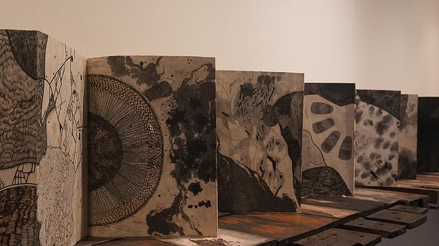 The theme for the ongoing exhibit emerged from a desire to shift the narrative perspective, placing the landscape, often relegated to the background, as the protagonist. Jain says, “Landscapes are more than just settings; they are living, breathing entities that hold memories, histories, and identities. The title reflects the idea that land is not a passive canvas but an active participant in shaping our lives, cultures, and collective consciousness.” This perspective not only celebrates the beauty of these settings but also confronts the realities of transformation and disruption that permeate our environments. Jain feels that pressing socio-political issues, such as climate change and displacement, are addressed, illustrating how human actions leave lasting imprints on the land. Some of the works on display have an oriental quality similar to those of Japanese art depicting the flora and fauna.