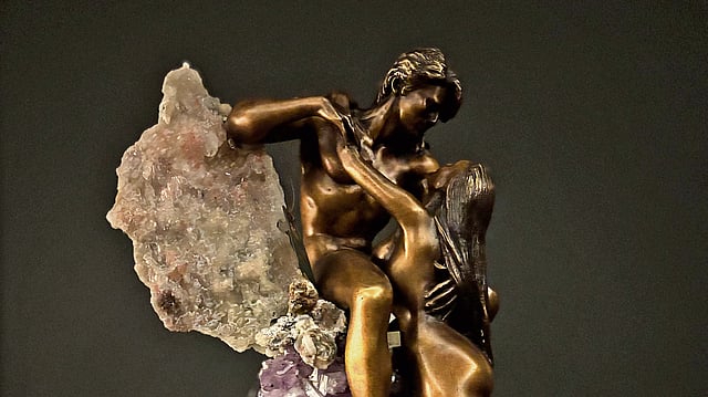 A beautifully sculpted couple are draped in each other’s arms as their bronze finish offsets the regal throne of purple amethyst atop which they sit. A fuchsia clock fashioned from a large agate stone, casts a striking effect with its naturally occurring variations of colour. A silver oyster shell, open to display the shining pearl within, is created in such painstaking detail as to make the viewer second guess whether it’s been crafted by nature or man.