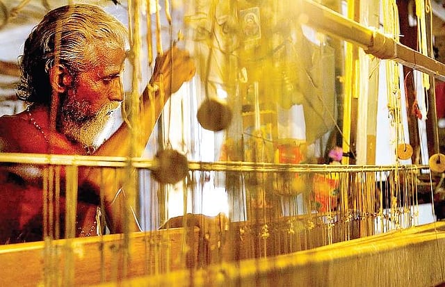 Crestfallen by Chellamma’s death, Dharma brings back a sari, which Allarmelu identifies as an ‘imposter’. Determined to give the lie/mistake away (for she was unwilling to believe that her uncle was trying to fool them), she gets him to read the story of the sari, written by the foster daughter of the man who had woven it in a Tamil village, whose name was woven into the hemline of the sari in the guise of a design by the doting father.