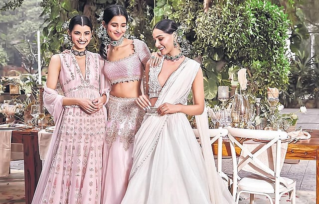 Everything about the collection is subtle and sublime. Combined with Indian jewellery and flowers, there is a sense of tranquillity that captures the poignant emotion of love shared with friends and family. “Anyone dressed in our ensemble will feel the embrace of perfection. We’ve incorporated a lot of play with organza and chiffon, embroidered raw silk, and exaggerated sleeves. It all creates the right amount of drama and daze,” says Mehra.