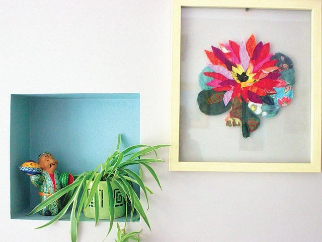Using all the fabric scraps at her disposal, she has created the most colourful artworks of flowers and birds. Pressed between two pieces of glass and framed, these make for the most eye-catching decor in any space. How did she come up with this? Necessity, she replies, was the mother of this invention.