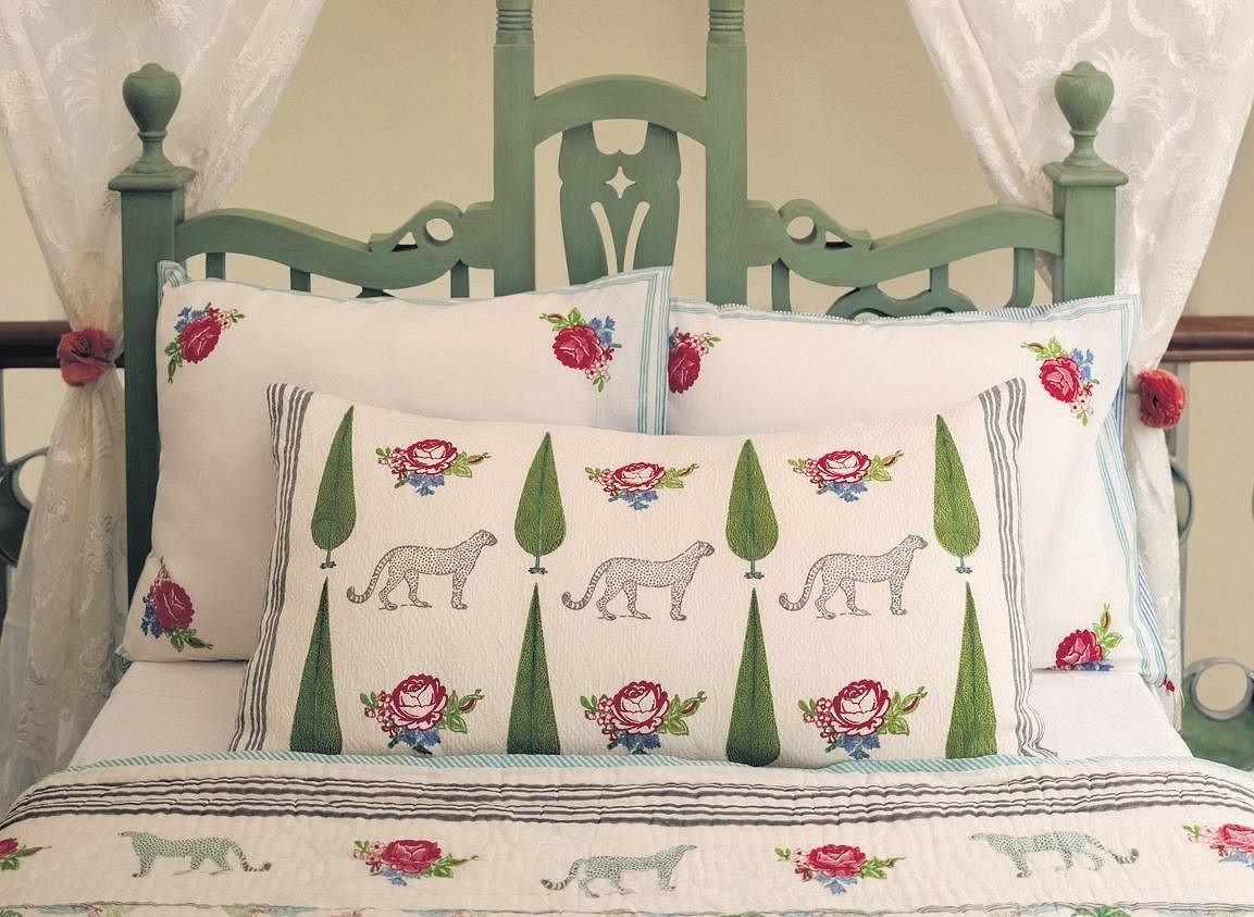 Next comes the Jewel Box, inspired by patterns on Ottoman brocades, which comprises jewel-toned cushions woven and embroidered in silk and velvet with gold and silver threads. Then, digitally printed on handloom silk, the Secret Garden collection presents an imagined journey from the hidden gardens of China down the Silk Road to the shores of the Bosporus, encountering magical cheetahs and peacocks in palm groves festooned with roses and jasmines.