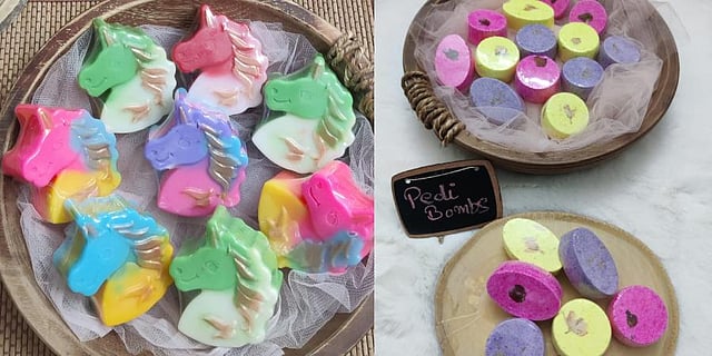 'The Bubble Trove' boasts of a range of products including bath salts, ubtans, bath bombs, Pedi bombs, body scrubs, and more. Some of the ingredients used are shea butter, coconut oil, vitamins, sandalwood, turmeric, saffron, goat milk, etc. They also have quirky soaps shaped like Superman, Batman, doughnuts, unicorns, and coffee beans. These soaps are reasonably-priced between Rs. 120 and Rs. 170 while their premium perfumed soaps (they are infused with the fragrances of Dior, Gucci, and Versace's perfumes) are sold for Rs 250.