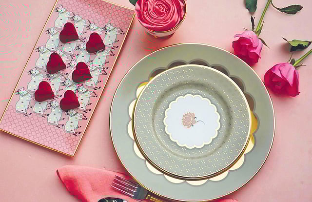 A glamorous Valentine’s Day celebration is all about setting the perfect table—whether you’re celebrating with the girls for that ultimate Galentine’s Day soiree or treating your Valentine to an intimate dinner for two. Which is why Kaunteya has unveiled a romantic table setting using its bespoke Pichwai tableware collection, styled with fresh pink roses and flowers, heart-shaped chocolates and pink napkins.