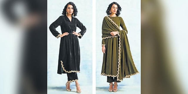 Crafted in soft, luxurious velvet fabric, the collection consists of pieces with relaxed fits and minimal cuts, and features the brand’s classic plunging V-necks, flares, and slits. Think kurta-pant sets, angrakha, pre-pleated saris, kaftans, jackets and shawls. The brand has also launched co-ord sets as a new category.