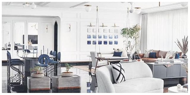 The drama starts from the foyer in black and white with piccolo mosaic tiles and a deep bluevestibule area. The large open living and dining area beyond is a study in subtle sophistication in whites, greys and blues.