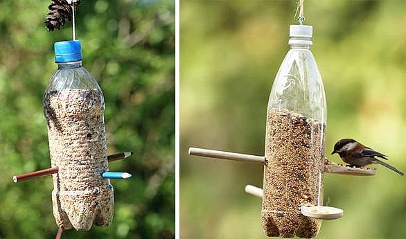 get a close view. Taking just a little time and even lesser money, you can make one out of a plastic bottle. Drill a few holes to insert some wooden spoons or pencils, fill up the bottle with bird feed and just hang it ready for the feathered friends to feast on.