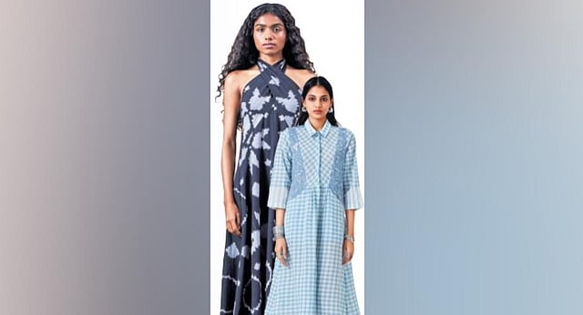 cord stripes with various shades of indigo. About the must-haves in the collection, the designer says, “One of the must-haves is the Sophie_489 dress. It is a free-size dress, gathered around the neck, with embroidered panels on the sides in lightweight silk cotton with contrast indigo jamdani brocade.”