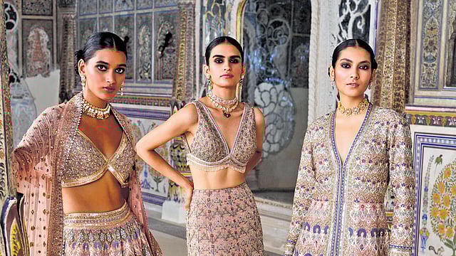 The hand-painted art of Pichhwai, Badla and Gota Patti from Rajasthan, the vibrant Bandhani from Gujarat and the age-old weaves from Varanasi are celebrated in a language that is global in its appeal. Dongre says, “Gota holds a special place in my heart as it’s from my home state. It was the first craft we worked with when we started our bridal line. Its exquisite embroidery enhances the grandeur and intricate detailing of our bridal wear, reflecting the opulence of Rajasthan’s craftsmanship.