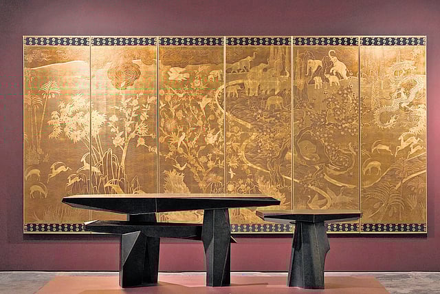 The collaboration has yielded three exquisite designs inspired by brass repoussé artworks, which de Gournay has transformed into stunning, bas-relief scenes on gilded paper— a technique achieved by rendering design elements in a special solution that creates a relief effect when heated. The collection was unveiled at Goyal’s studio in New Delhi and was previously showcased at the de Gournay London showroom for the PAD London fair, 2024.