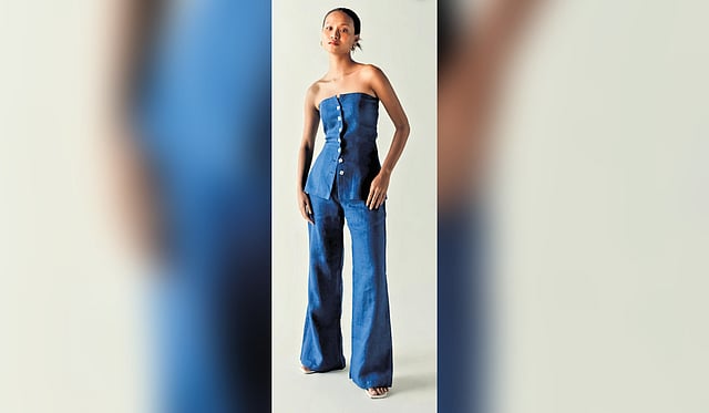 This mid-rise flared jeans by Saaksha & Kinni come with exaggerated stitch pocket detailing. For the perfect look, mention your height while placing your order. The designers call baggy jeans the It-girl ensemble of the season. The jeans make a bold statement as they are oversized, versatile and can be dressed up or down, they say.
