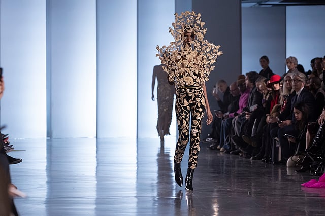 On the runway, geometric 3D designs on capes and gowns took centre stage–symbolising skyscrapers and urban settlements. The colour palette was dominated by black, grey, and flashes of gold – a departure from Mishra’s liberal use of vibrant shades. Exquisite hand embroidery–zardozi, aari or sequined embellishments depicted the resurgence of flora in the absence of humans.