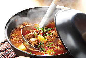 Hungarian cuisine has been heavily influenced by the history of the ethnic Magyar people. The importance of livestock and farming and the nomadic lifestyle of the Magyar people is apparent in the prominence of meat in Hungarian food and may be reflected in traditional meat dishes cooked over fire like goulash. In Hungarian, gulyás, literally means "herdsman's meal". Pörköit stew and the spicy fisherman's soup called Halászlé are all traditionally cooked over the open fire in a bogrács (or cauldron).