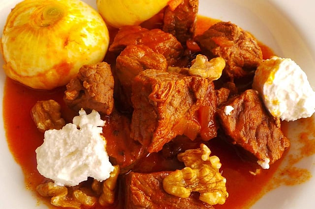 The name comes from the Italian stufato, and the Greek version probably results from the influence of Venetian overlordship in the Middle Ages when Venice played such a large role in Greek affairs, especially in the Ionian Sea. On the other hand, the spices, the clove and cinnamon, as well as the walnuts and currants, point to some Turkish or other Levantine influence, too, which is logical when we remember that the Turks controlled most of Greece for 500 years.