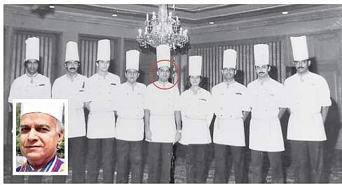 Photograph of Chef Arvind Saraswat (encircled) from the archives of the Taj Group, heading a team of young chefs; (inset) Chef Saraswat in his later years