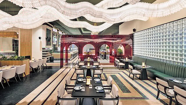 Decor: The mood panders to a light lunch on-the-go to a business dine-in to a more intimate setup, with a colossal 10,000 sq ft space. A scarlet tunnel leads into the heart of the restaurant, with stunning Oriental artistry on the ceiling in the private dining area. High chairs at the expansive, well-studded bar, plush sofas, wicker lamps, and murals compose the Asian symphony. The showstopper is the origami light installation spanning 75-ft-long panels across the dining space.