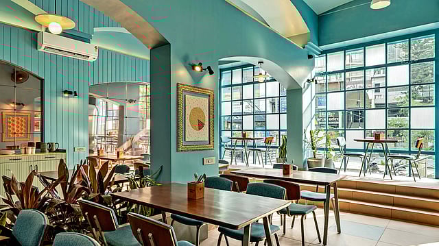 Décor: The place is done up in bright shades of blue with bright red toned framed posters that add a cheery vibe. The 40 seater space also has a couple of seats that face the road.