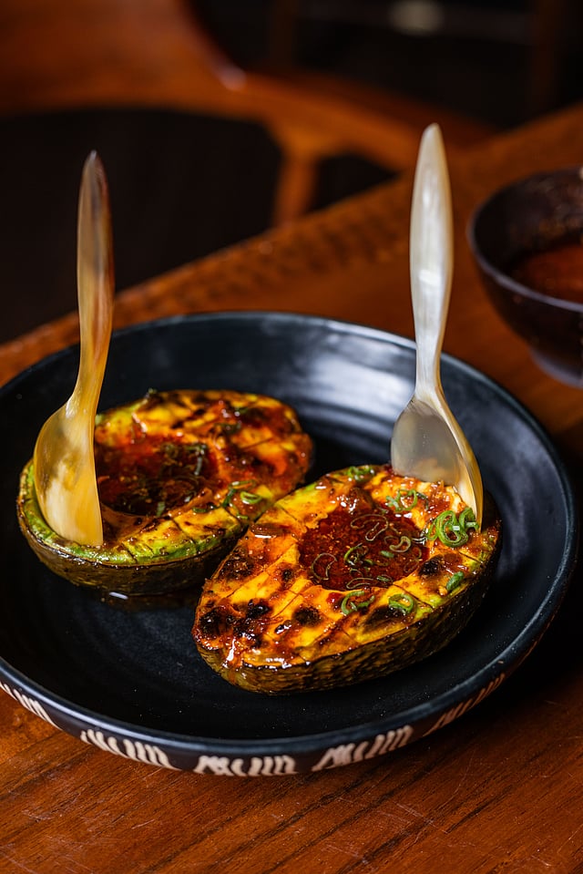 Décor: Outside, a breezy perch invites al fresco indulgences, while inside, revelry takes centre stage—quite literally—with a DJ booth seamlessly stitched into a communal dining table. The scene-stealer? A towering 15-foot robata grill, exuding primal allure in the otherwise intimate setting.