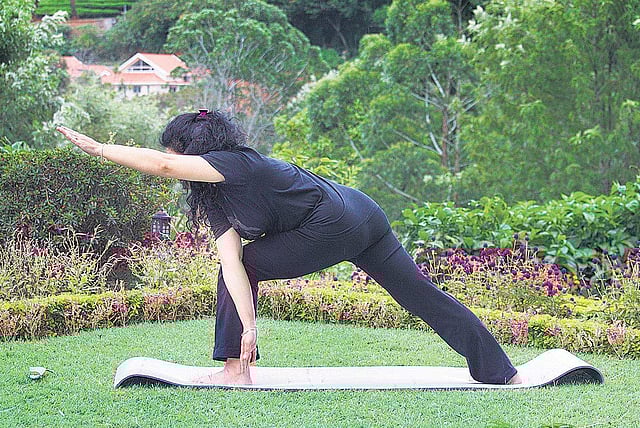 CHENNAI : This translates as extended flipped side lateral angle posture. Utthita ‘Parivratta’ ParsavaKonasan is a ‘flipped’ variation of the yogasan we looked at last Thursday- UtthitaParsvaKonasan. Steps 1-3 remain the same as last week. This is a compound stretch as many muscle groups are involved. STEPS: Side step with your right leg to turn 90 degrees or jump with your feet apart by 4-5 feet. Swivel your right foot out clockwise to 90 degrees and your left foot the same way to about 30 degrees. Your right kneecap will be facing the direction of your right toes.