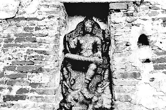 The magnificent lord sits facing the east with only a Rudraksha Mala adorning him. What would have been a sanctum sanctorum that once saw several festivals and a Lord who would have been adorned in the best of robes and jewellery, he now sits humbly, yet regally, waiting for devotees. My heart skipped a beat, when I saw the deep crack from the roof going down the back of the temple slashing through the Gaja Brishta. This Dakshinamoorthy, said to date back to the 9th Century, is seen with his right leg placed on his left. Chandikeswara stands alone in the open air, in his usual position, with no roof over his head.