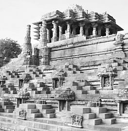 Of the 100-odd Sun temples in Gujarat, this temple at Modhera is the most known. Now a ruin by the river Pushpavati, 102 km from Ahmedabad, the temple built in 1026 AD by King Bhimdev of the Solanki dynasty, is under the protection of the Archaeological Survey of India. The mystic aspect of the temple is the axial alignment with two intricately carved Sabha and Guda Mandapas as well as the Surya Kund—as the temple tank is called—with the Tropic Of Cancer passing through the heart of all three structures. Through a interplay of geometric patterns, pyramid-shaped stairs take you down to the water level. More than hundred miniature idols carved in between the steps of the tank at four levels speak of the devotion of long dead royal sculptors. The japmala has 108 beads. As one goes down step to step, or rather terrace to terrace inter-linked by steps, the reflection of the ancient shrines glitter in the green waters below.