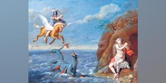 As the sea monster appeared on the scene, Perseus asked Andromeda’s parents to marry her to him if he were able to save her from the monster. The hapless parents agreed. Perseus soared into the sky and landed on the sea monster’s back, plunging his sword into its shoulder.
