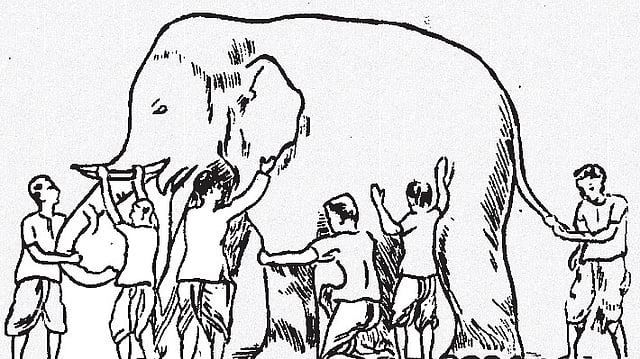 This is illustrated by a story found in Jainism, as well as Buddhism and Hinduism. Six blind men residing in a city learnt that a new kind of animal called ‘elephant’ had been brought to their city. Curiosity led them to where the animal was. Unable to see the elephant, they tried to feel it with their hands. One man touched its trunk and claimed that the elephant was like a thick snake. The second one touched its tusk and claimed that the elephant was hard and sharp like a spear. The third one touched its ears and said that the elephant was thin like a fan. The one with his hands touching the sides of the elephant claimed it to be like a wall. The fifth one feeling its leg reported it to be like a pillar. The sixth one caught hold of the elephant’s tail and claimed it to be like a rope. Instead of fighting violently to prove their versions to be true as they do in some versions of the story, anekantavada says the blind men should understand that each of their statements had some element of truth, but none described the complete truth.