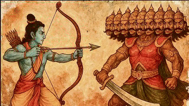 During the battle with Ravana, Rama demonstrated how one can respect even one’s fiercest enemy. The battle was brutal. Both warriors fought valiantly and used fearsome weapons. Rama attacked Ravana angrily, destroying his chariot and bow. This was a critical moment in the battle. Ravana had done great injustice by abducting Sita. Rama had long made efforts to free Sita from Ravana’s clutches—he had gathered an army of monkeys and bears and travelled thousands of kilometres across forests in search of her and finally crossed a vast ocean to reach Lanka. He then waged a difficult battle against Ravana’s fearsome rakshasa army. After making all these efforts, this was the moment when Rama had a chance to finish it all. Ravana had been sufficiently weakened by battle and was close to being defeated. It would be natural to expect Rama to deliver the final blow without a moment’s delay.