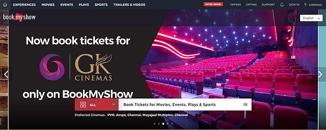 Screengrab of the home page of the BookMyShow website.