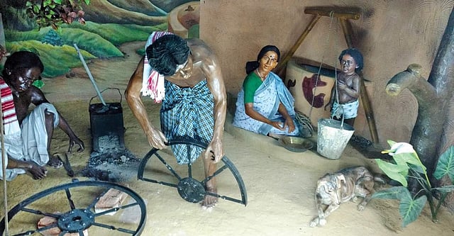 As each of the tribes is known for a specific profession, they are depicted performing their vocation. The Lohar tribe is seen burning coal and hammering iron to make crude agricultural implements. The ancient Asur tribals are smelting iron and producing tools. The farming Mundas have sickles in hand and goats tied near their huts. Such realistic display also give a fair idea of their living space, dressing style and implements they had.