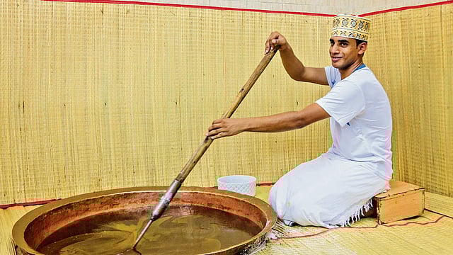 Start in Nizwa. At first glance, it’s a sleepy fort town nestled in the folds of the Al Hajar range. But walk through its winding souqs and you’ll catch the warm, floral pull of Omani halwa. Cooked down for hours in heavy-bottomed cauldrons until it shines like lacquer, this dense, spiced dessert is perfumed with cardamom, rosewater, and saffron. There’s a flicker of familiarity like that of Karachi halwa, but the Omani version feels more meditative. It isn’t just a sweet. It’s a relic, a ritual, an edible heirloom passed through families shaped by the monsoon winds of trade with Persia, East Africa, and coastal India.