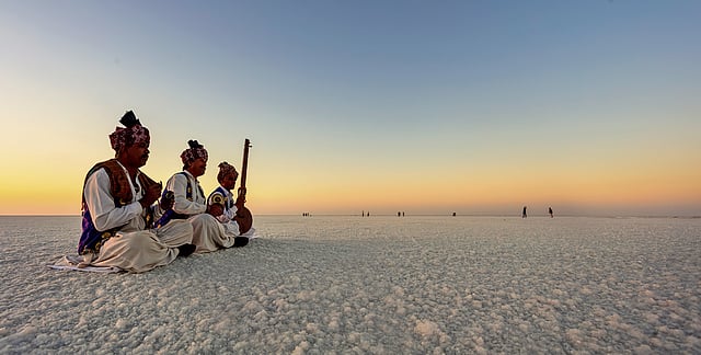 “Even as the road leads to a world heritage site, many tourists come here for the road itself,” says Iqbal Kumbhar, Senior Tourist Guide, Evoke Experiences. During the Rann Utsav, a four-month festival from November to February, the road sees the heaviest footfall. Sprawling across 5 lakh sq metres, the Rann Utsav Tent City captures the spirit of Kutch into a single landscape—its arts and crafts, folk music and dance, the ingenuity of its communities, and even the region’s vast geography, experienced through activities like stargazing. Set in the quiet village of Dhordo, the over 400 tents echo the whiteness of the surrounding salt desert: softly lit structures of white fabric, designed with sustainable features such as eco-friendly bhunga homes in each cluster and benches made from recycled plastic.