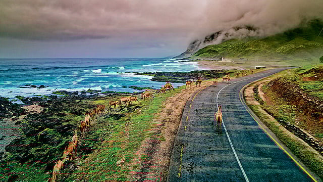 Salalah’s true magic unfolds beyond the city limits. As the Khareef or seasonal monsoon arrives, the region transforms into a mist-laden paradise and the sounds of nature take over.A short drive away, Wadi Darbat becomes an idyllic picnic spot, where turquoise pools shimmer with the Travertine Curtain waterfall in the backdrop.