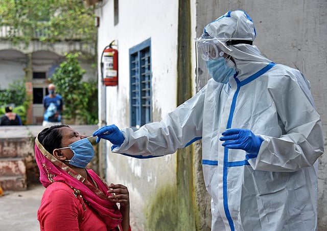 A health worker collects swab samples from a woman for the COVID-19 test. (Photo| ANI)