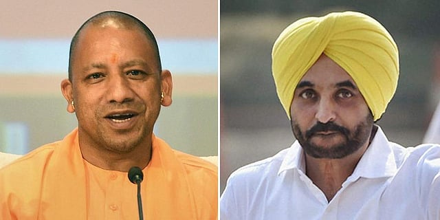 Uttar Pradesh CM Yogi Adityanath (L) and AAP's Punjab CM face Bhagwant Mann. (Photo | Agencies)